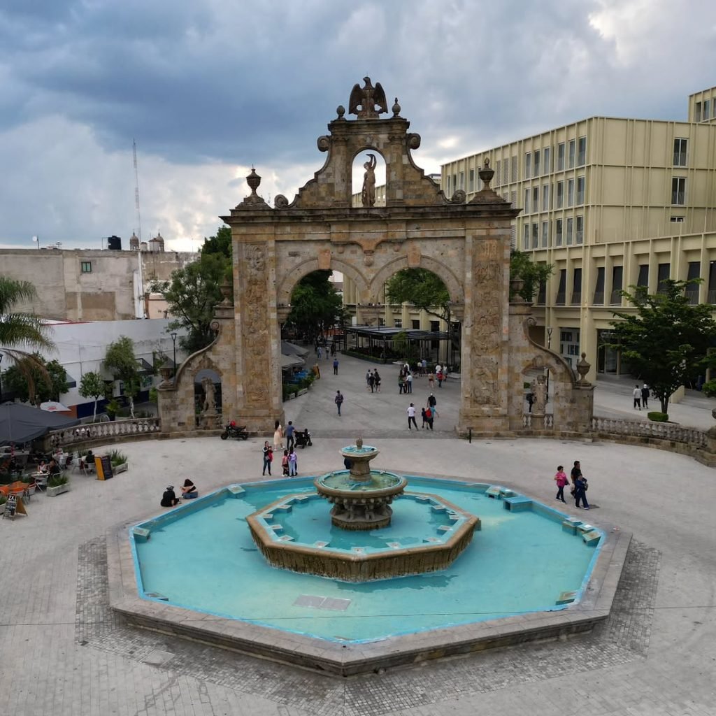 La vista aérea resalta la simetría y el detalle del arco central, que se alza como una puerta simbólica hacia un Zapopan lleno de vida. Este sitio no solo es un atractivo arquitectónico, sino también un recordatorio de la importancia de preservar los espacios que forman parte del patrimonio cultural de la región