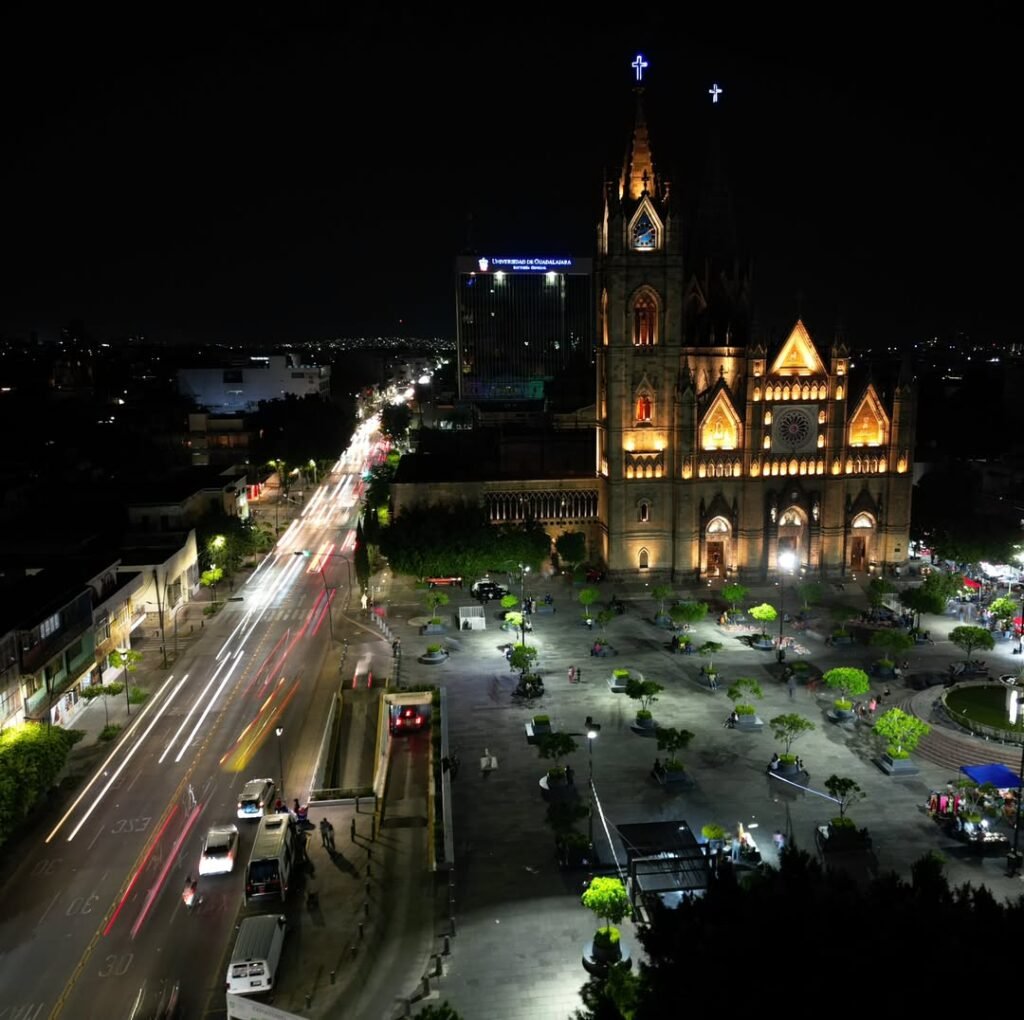 Esta imagen no solo captura un instante, sino una esencia. La combinación de historia, modernidad y la habilidad técnica detrás de la fotografía nos invita a redescubrir la ciudad desde una perspectiva diferente, donde las luces y sombras crean un contraste único que realza la belleza de Guadalajara