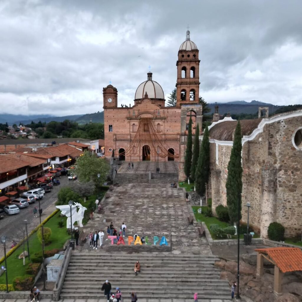 En esta imagen aérea, la iglesia principal de Tapalpa se muestra en todo su esplendor, destacando con su fachada de ladrillo rojizo y sus dos torres coronadas por cúpulas. Frente a ella, las escalinatas que conducen desde la plaza central se convierten en un punto de encuentro para locales y visitantes, y en el centro, las letras de “TAPALPA” dan la bienvenida a quienes llegan a este Pueblo Mágico enclavado en la sierra.